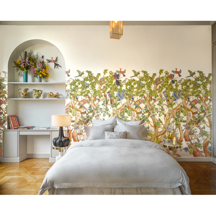 Artists from both design houses hand-painted the ornamented fauna within this expansive tableau; the distinctive Cole & Son hand blending seamlessly alongside Ardmore’s characteristic style.