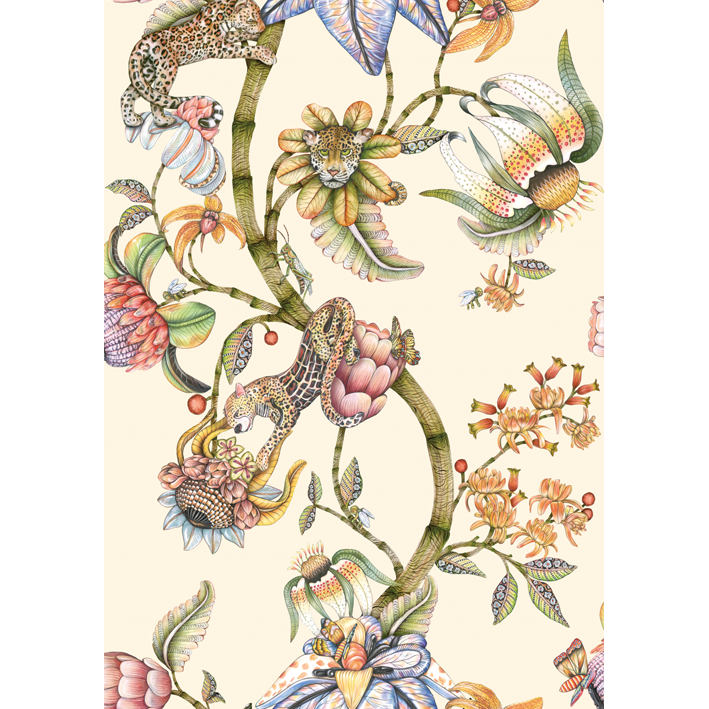 The whimsical and slightly surreal Protea Panthera is an ode to the beauty of Ardmore’s ceramics. Proudly centring around South Africa’s national flower, the protea, big cats dance along its central vine and a pair of striking green eyes look out from one prominent bloom. Surrounded by intricately embellished flowers, leaves and bugs, Protea Panthera’s grand scale captures the wild beauty of South Africa.