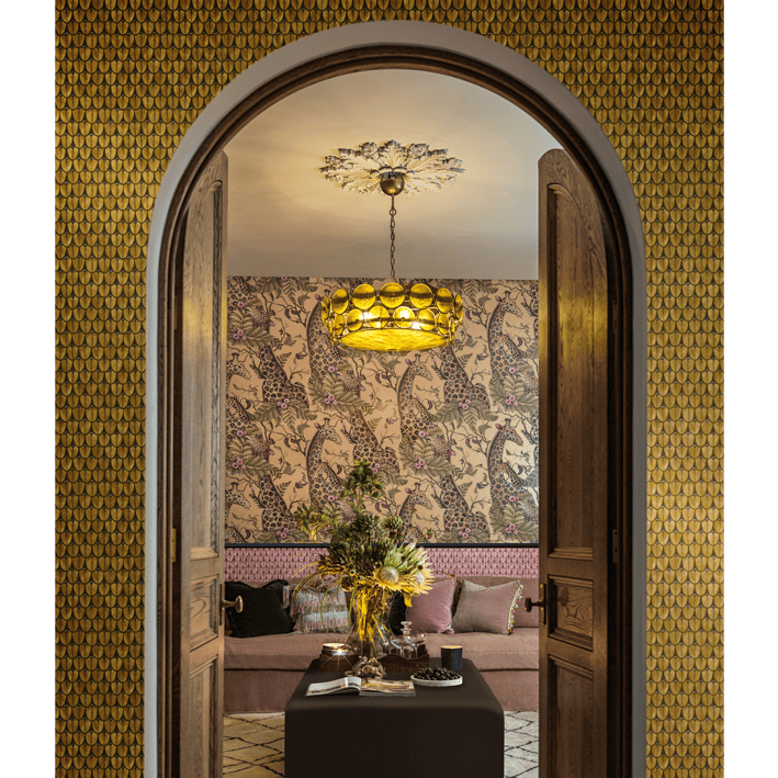 Sharing its name with the beautiful Narina Trogan Bird native to KwaZulu-Natal, Narina is derived from the detailed patterning found on many Ardmore bowls and vases. Cole & Son artists have created a soft watercoloured geometric design using the stylised feathers of the Narina Bird to produce a subtle yet unusual semi-plain wallpaper.