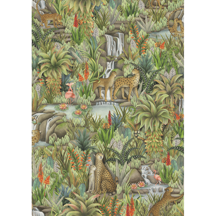This lush display contains numerous animals, including big cats, flamingos, and fish, with more unfolding the further you look. Injisuthi’s three colour palettes are representative of this changing botanical landscape with the verdant Jade showing the scene in full abundance; Viridian turning the scene from day to dusk; and Stone & Sand showing that even when the seasons become arid and plant-life becomes parched, life continues and rejuvenation is waiting just around the corner.