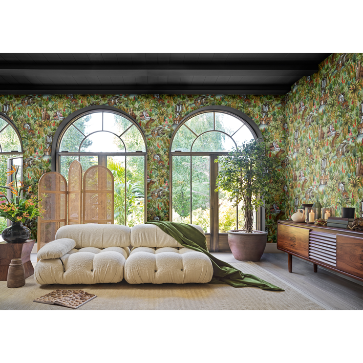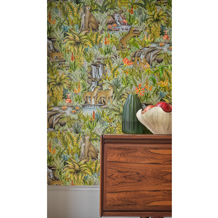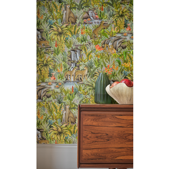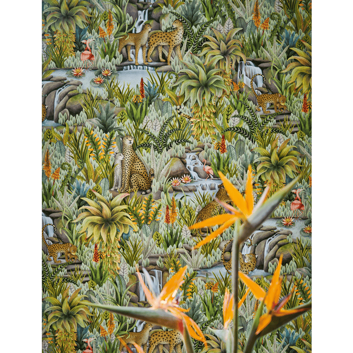 This lush display contains numerous animals, including big cats, flamingos, and fish, with more unfolding the further you look. Injisuthi’s three colour palettes are representative of this changing botanical landscape with the verdant Jade showing the scene in full abundance; Viridian turning the scene from day to dusk; and Stone & Sand showing that even when the seasons become arid and plant-life becomes parched, life continues and rejuvenation is waiting just around the corner.