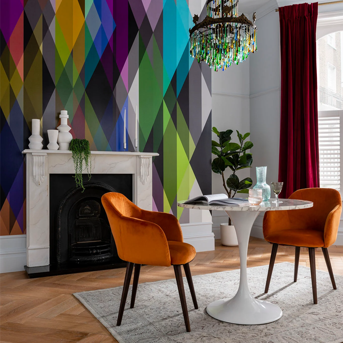 Circus is a striking large-scale wallpaper panel of overlapping multi-coloured harlequins. Panels can be repeated around a room for an immersive, kaleidoscope of colour or used singularly as a feature.
