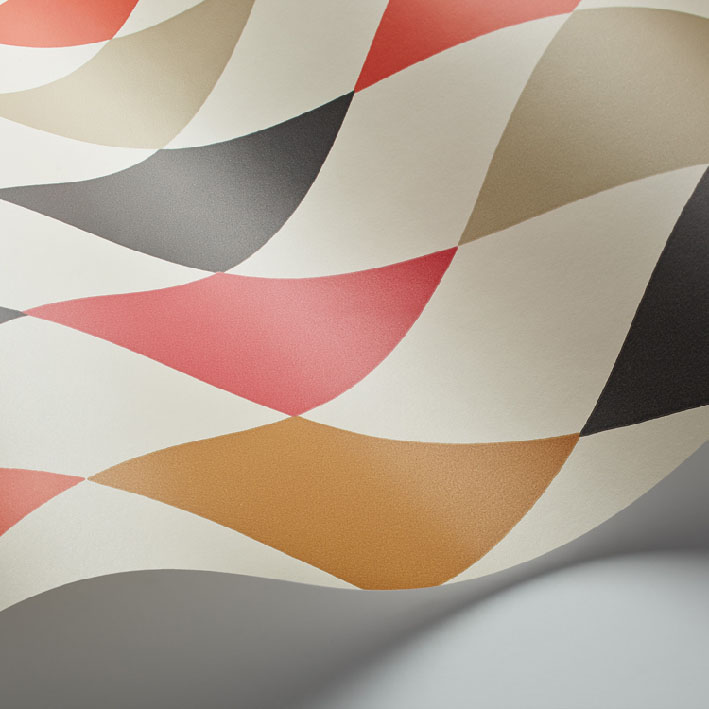 One of the signature designs within the collection, Punchinello, named after and inspired by the rascally character from the Commedia dell'arte, is a striking harlequin paper printed in contrasting colourings of chalky pastels, subtle gold, moody charcoal, soft reds, and an eye catching red and black.