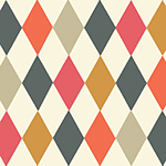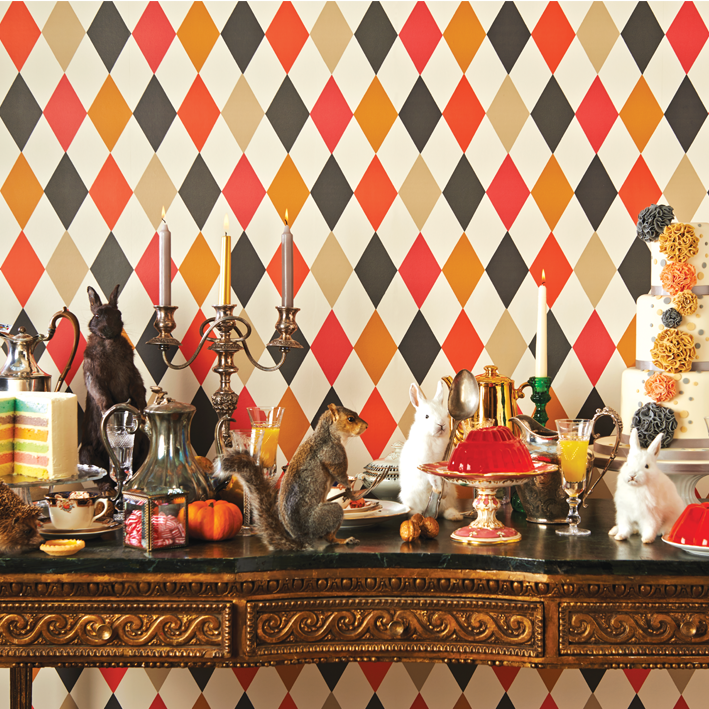 One of the signature designs within the collection, Punchinello, named after and inspired by the rascally character from the Commedia dell'arte, is a striking harlequin paper printed in contrasting colourings of chalky pastels, subtle gold, moody charcoal, soft reds, and an eye catching red and black.