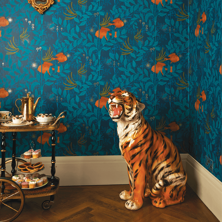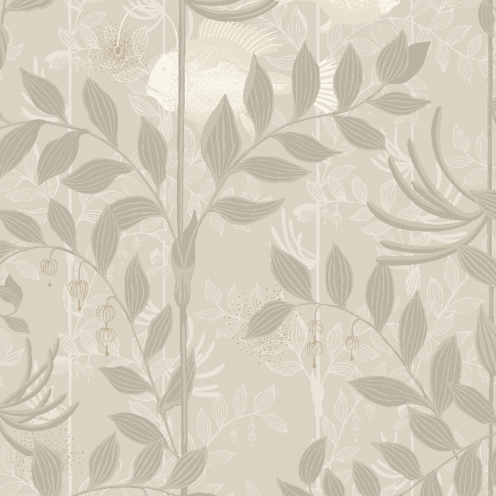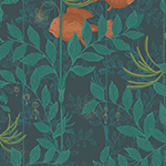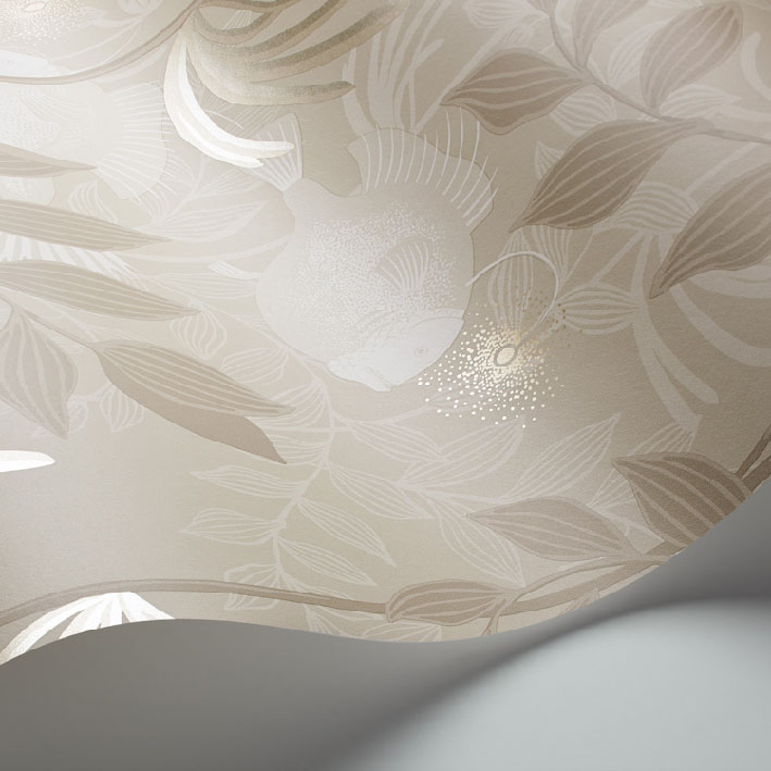 This charming design stars a pair of enigmatic anglerfish shimmering in a dreamlike landscape of underwater plants and tendrils. Presented in palettes of soft olive and pink, subtle neutral and gilver, striking green and orange, and deep indigo and yellow, Nautilus, like its namesake, reveals a magical underwater world within a world.