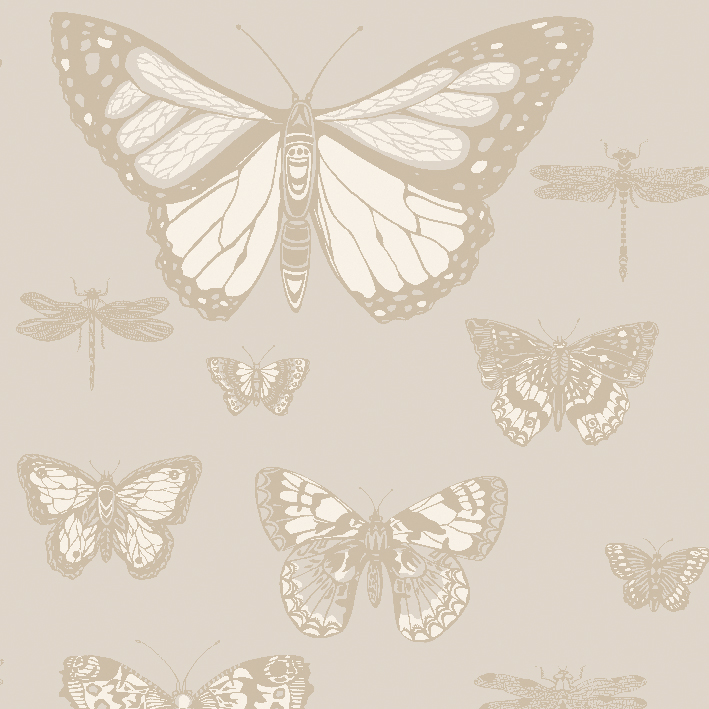 Taken from the Cole & Son archives, Butterflies & Dragonflies is an elegant design which surprises with its scale. It features large graphic butterflies and dragonflies in shimmering metallics on cool neutral grounds, with the addition of a more unusual emerald green and gold on deep charcoal, and a bright pink on blue.