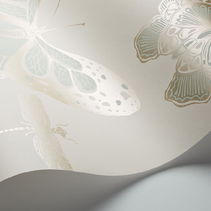 Taken from the Cole & Son archives, Butterflies & Dragonflies is an elegant design which surprises with its scale. It features large graphic butterflies and dragonflies in shimmering metallics on cool neutral grounds, with the addition of a more unusual emerald green and gold on deep charcoal, and a bright pink on blue.