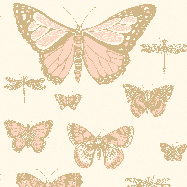 Taken from the Cole & Son archives, Butterflies & Dragonflies is an elegant design which surprises with its scale. It features large graphic butterflies and dragonflies in shimmering metallics on cool neutral grounds, with the addition of a more unusual emerald green and gold on deep charcoal, and a bright pink on blue.