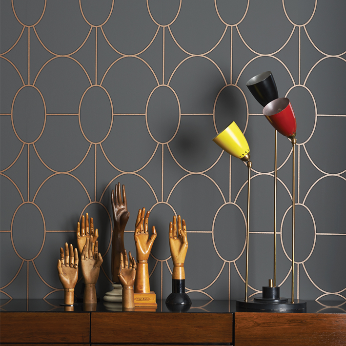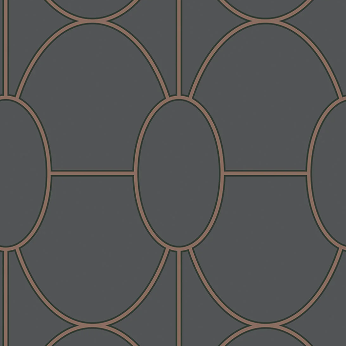 Offering a softer and more graceful take on the geometry and linear styles of the Art Deco period, Riviera features gently curved interlocking ovals printed in a softly raised textured finish. Presented in classic neutral colourings of black and white, graphite on grey, charcoal on sand, and metallic bronze on charcoal, this large-scale design creates a bold, contemporary look.