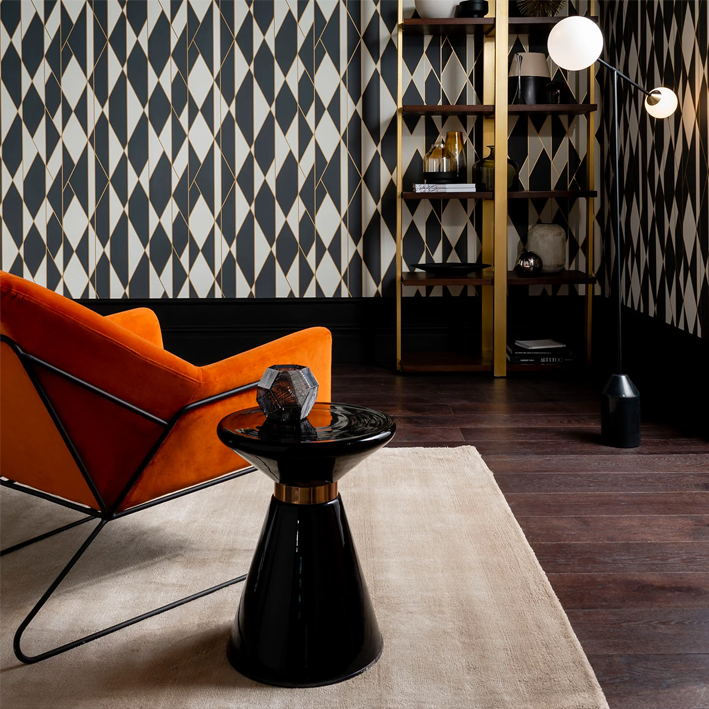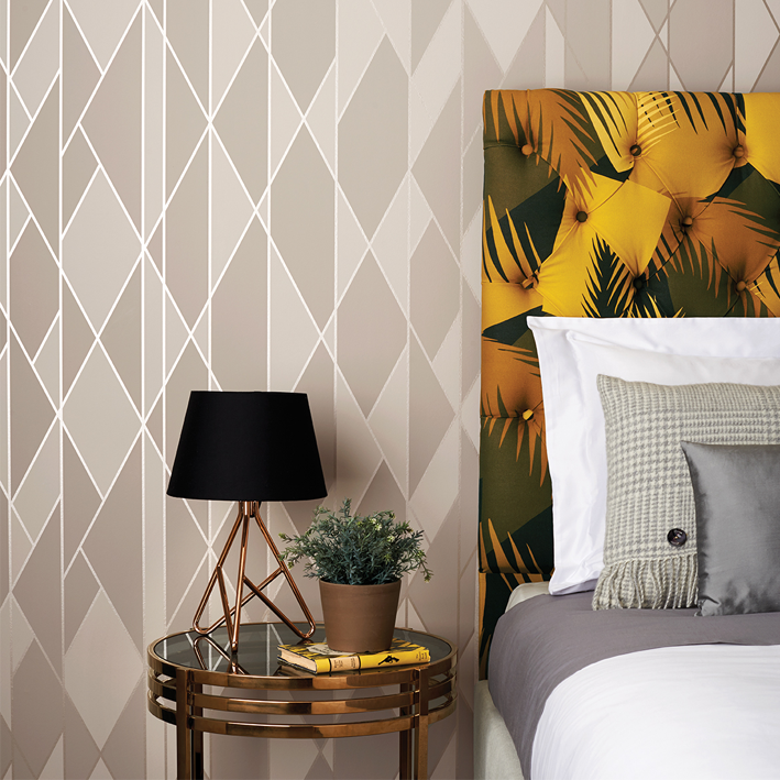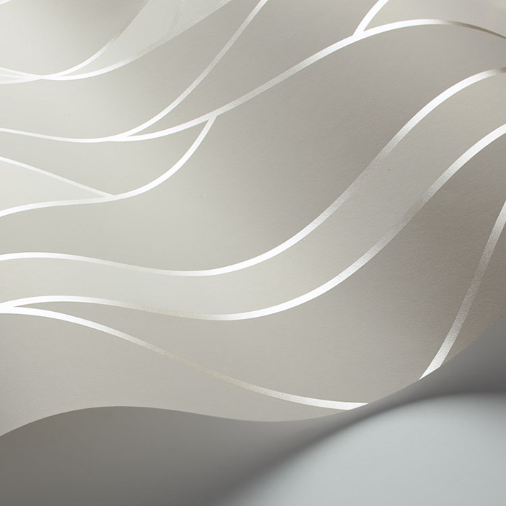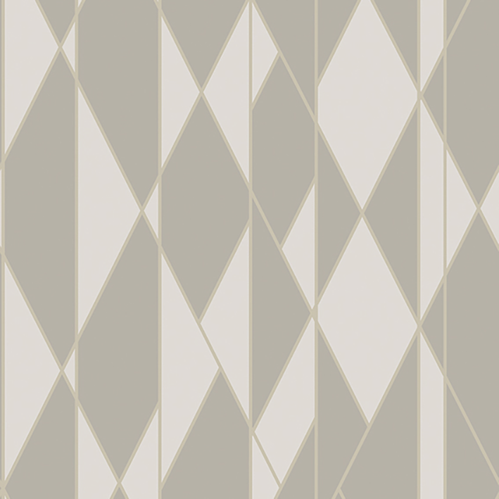 Taking its name from geometric, non-parallel, angled lines, Oblique is printed in two-tone colourings and criss-crossed with fine ribbons of soft gleaming metallic, creating a classically glamorous wallpaper. Colour palettes include soft greys with silver, cream on ivory with gold, bold black and white with gold, and teal on charcoal with bronze.