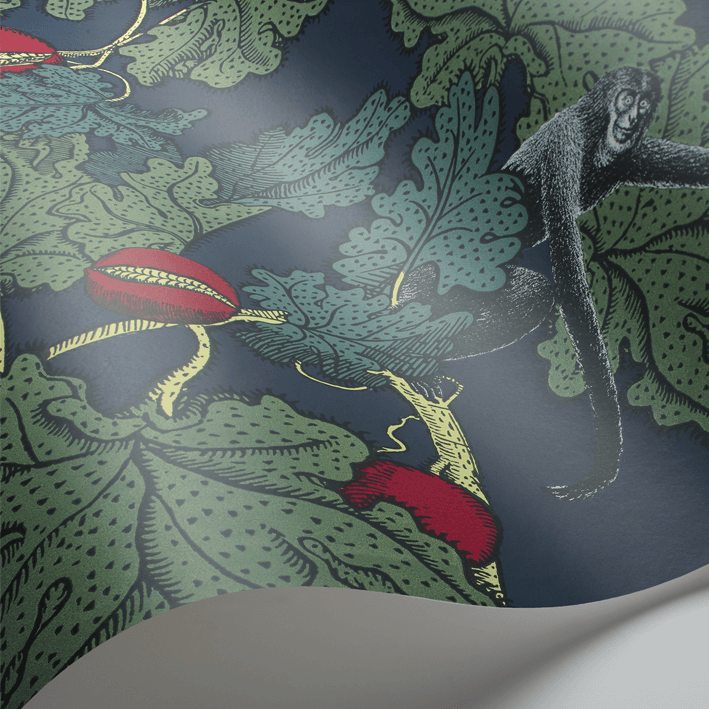 Frutto Proibito gloriously combines different archival Fornasetti motifs from the 1940s and 50s. Mischievous monkeys, originally conceptualised as striking wooden panels for the Milanese patisserie, Dulciora, sit amongst sprawling pomegranate tree branches. The playful composition of flora and fauna is quintessentially Fornasetti, mixing lifelike etchings with decadent, bold prints.