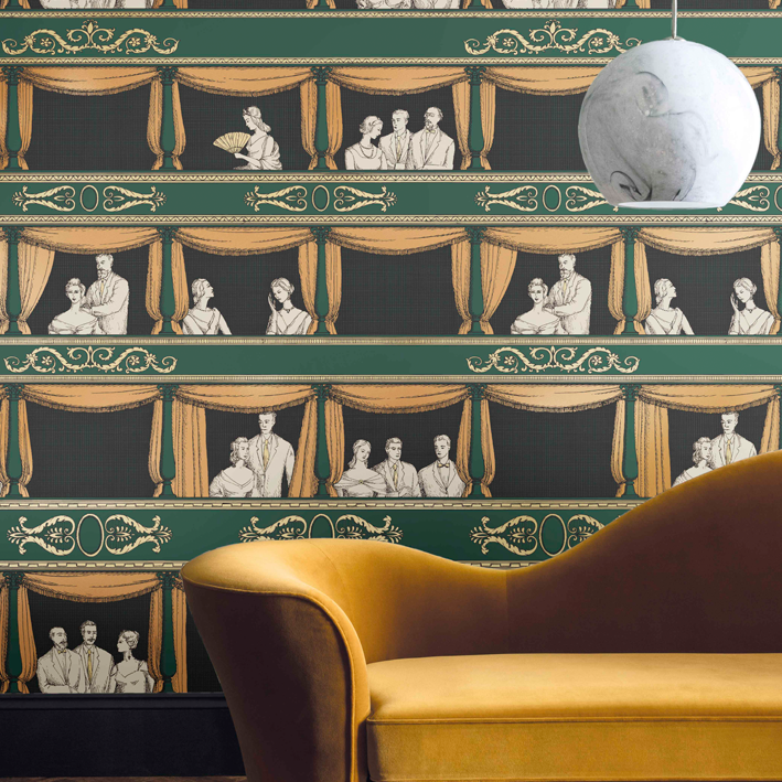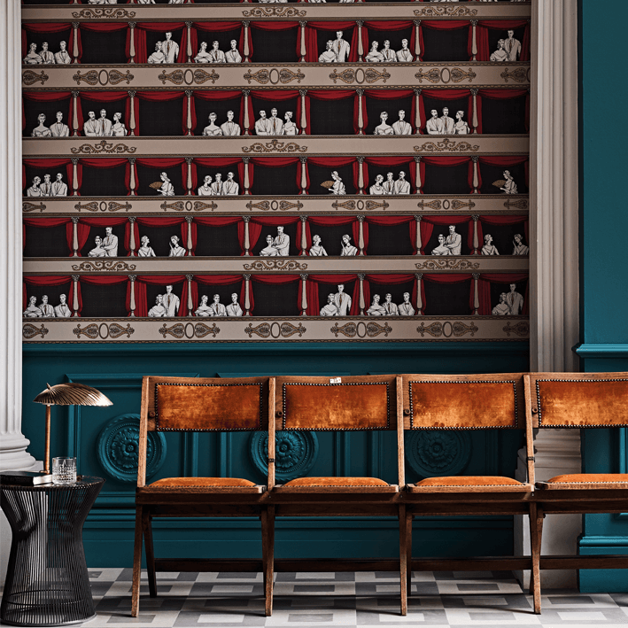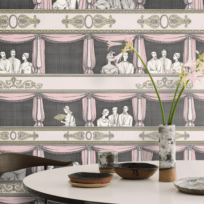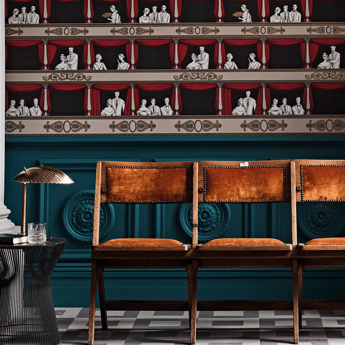 Piero Fornasetti had a deep love and admiration for music and theatre finding a wealth of inspiration from the Italian Commedia dell'arte. From this came the delightful Teatro. As charming today as it was then, Teatro was conceptualised in the 1950s. The scene is enthralling with intricate line work depicting elegant theatre goers. Delicate re-colourings play towards the design's theatrical inspiration alongside timeless Fornasetti palettes.
