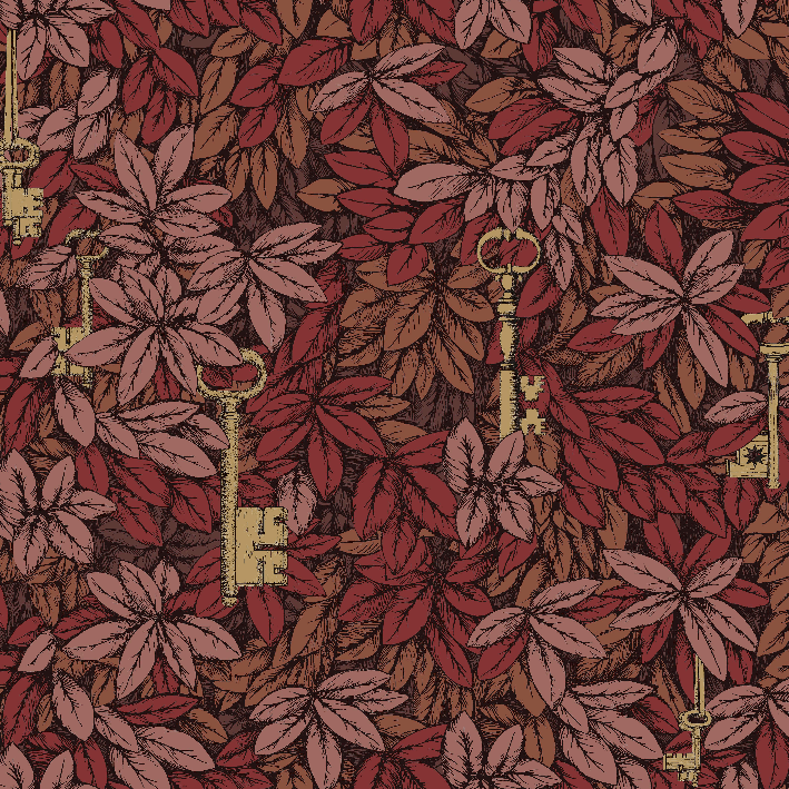 The much-loved Chiavi Segrete combines two influential Fornasetti motifs: mystical, dense leaves concealing golden, antique keys. This fanciful design has a magical quality, drawing the eye through and around the leaves to discover each of the 'secret keys' hidden within. Muted shades give way to true-to-life tones of spring undergrowth, with seasonal twists of autumnal leaves and wintery greys.