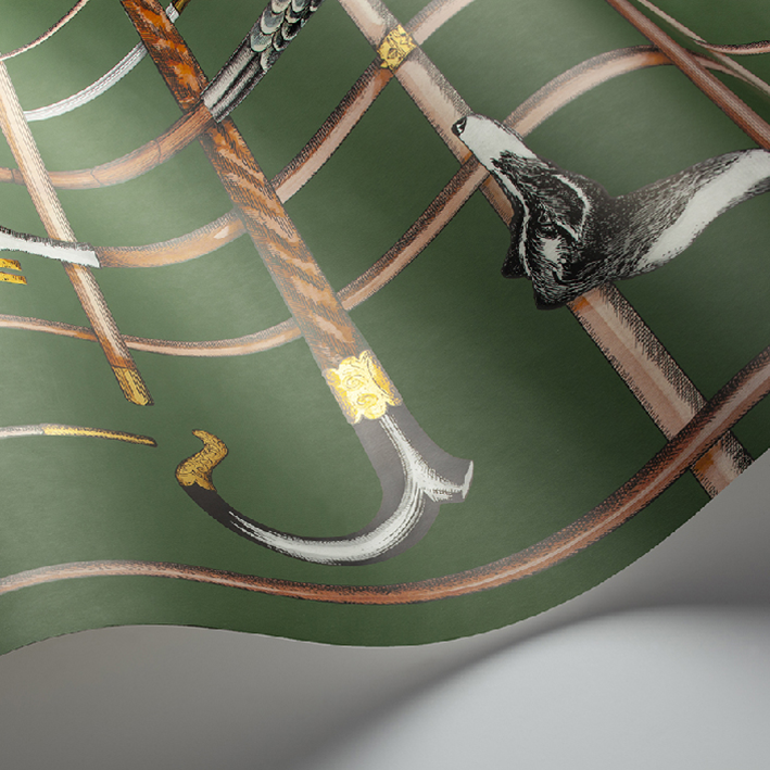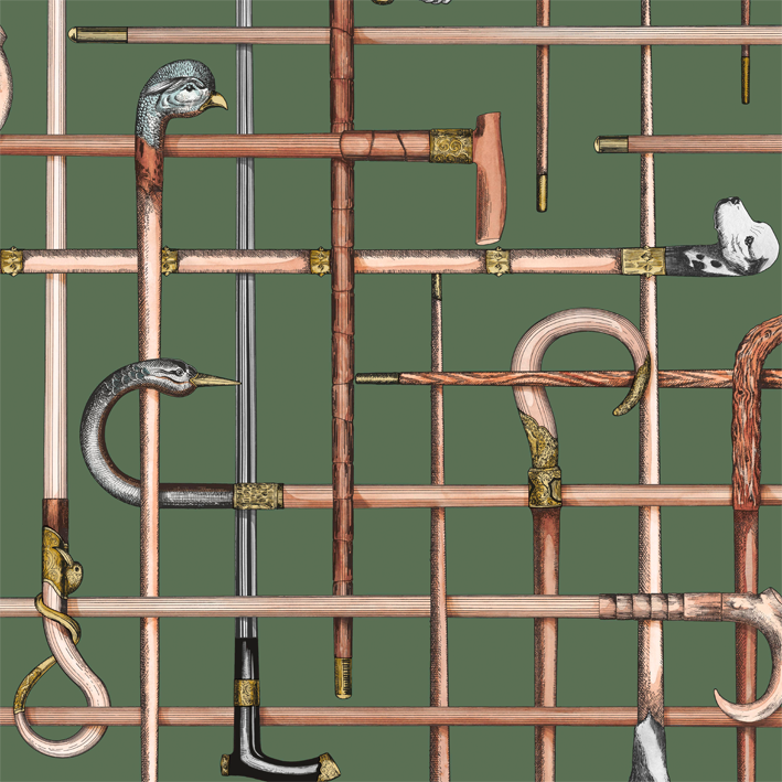 Originating as a silk scarf print from the 1940s, the canes of Bastoni reflect the eclectic nature of the house of Fornasetti, brimming with umbrella and hat stands full of antique walking canes. The graphic checkerboard style of the repeat is reminiscent of many Fornasetti favourites, resulting in a striking and bold motif. Bastoni is printed with a gravure four-colour process, to ensure all details remain sharp, with flecks of tonal metallic detail added in a luxurious gold. Choose from three classic colourways of Cream, Racing Car Green, and Charcoal.
