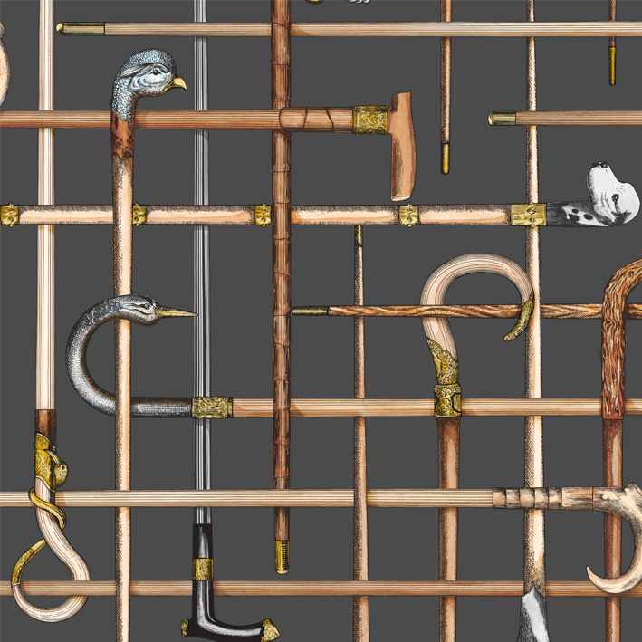 Originating as a silk scarf print from the 1940s, the canes of Bastoni reflect the eclectic nature of the house of Fornasetti, brimming with umbrella and hat stands full of antique walking canes. The graphic checkerboard style of the repeat is reminiscent of many Fornasetti favourites, resulting in a striking and bold motif. Bastoni is printed with a gravure four-colour process, to ensure all details remain sharp, with flecks of tonal metallic detail added in a luxurious gold. Choose from three classic colourways of Cream, Racing Car Green, and Charcoal.