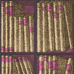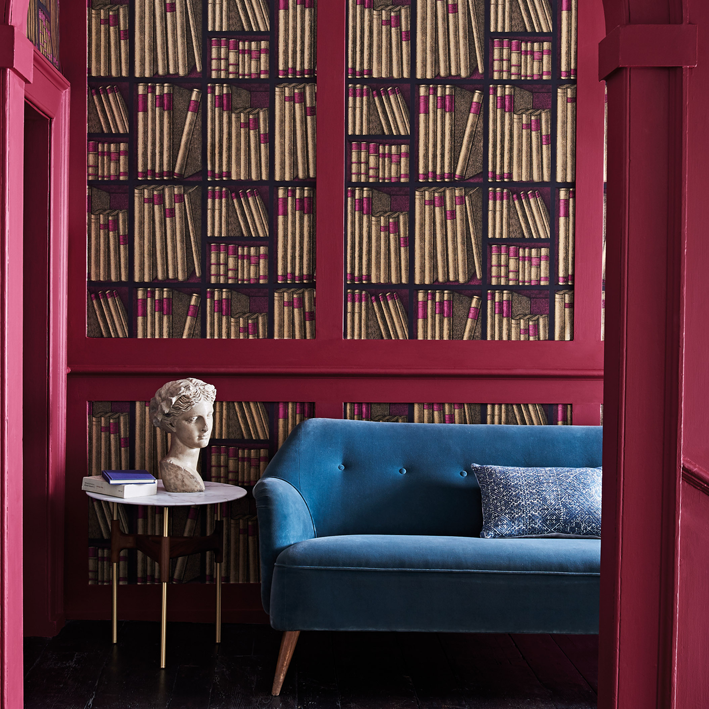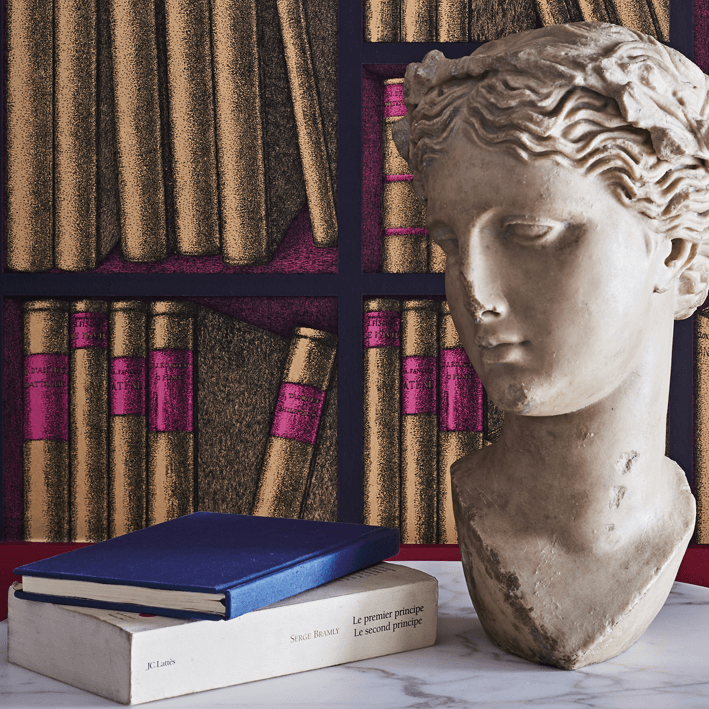 An avid collector of literature volumes on the applied arts, Fornasetti used books as a recurring theme which can be found throughout the Atelier's archive. The library Trompe l'oeil scene of Ex Libris, abundant in leather-bound books, is adapted from a 1953 screen