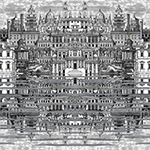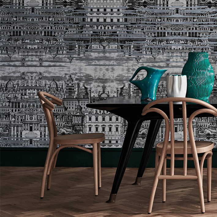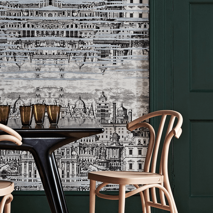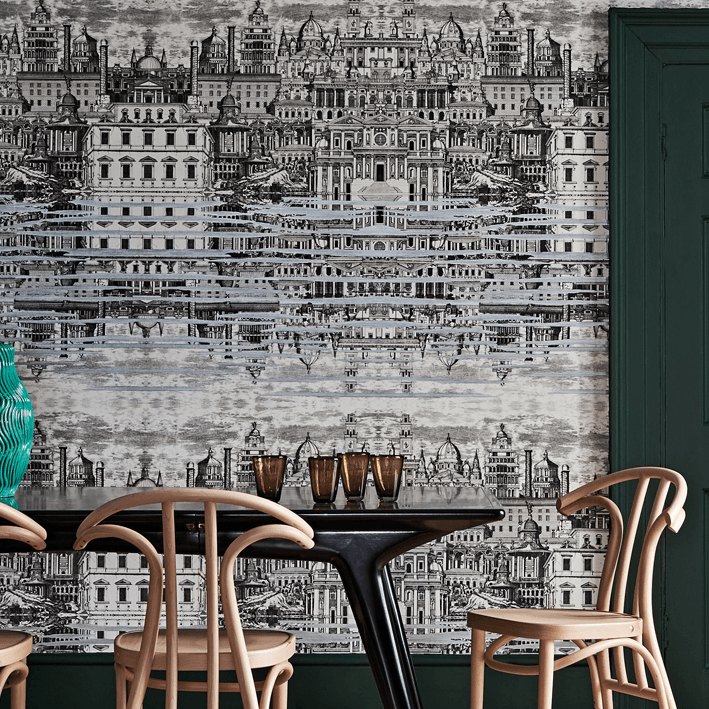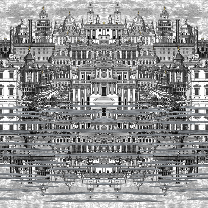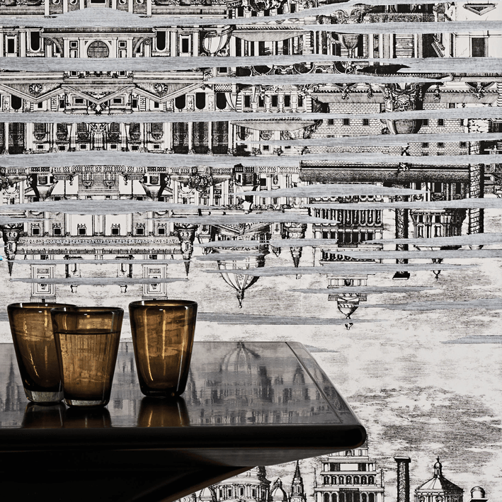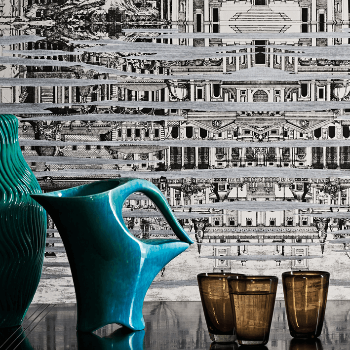 Riflesso is an atmospheric reflected depiction of Baroque Rome as seen through Fornasetti's surrealistic eye circa 1955. The right side is a mirror image of the left, with the scene reflected below in the water. Available in Black and White with icy silvered highlights