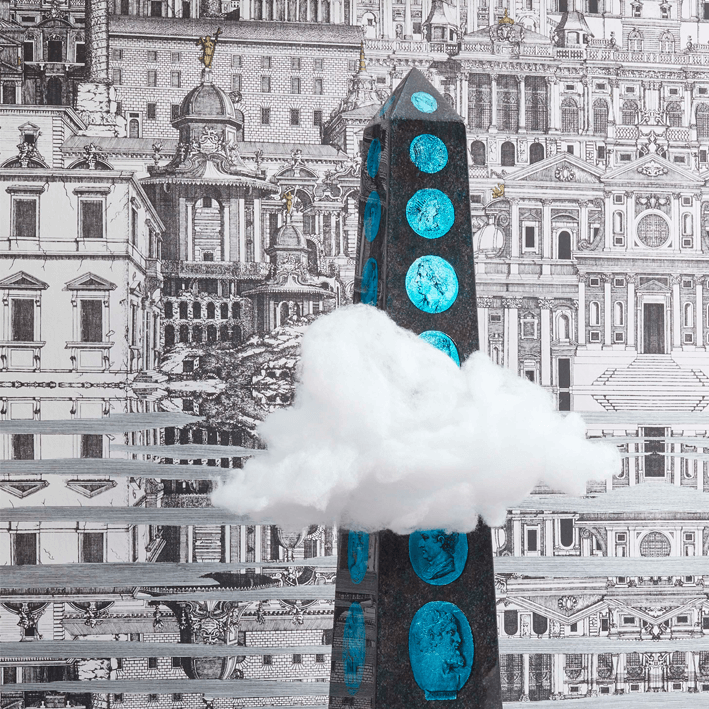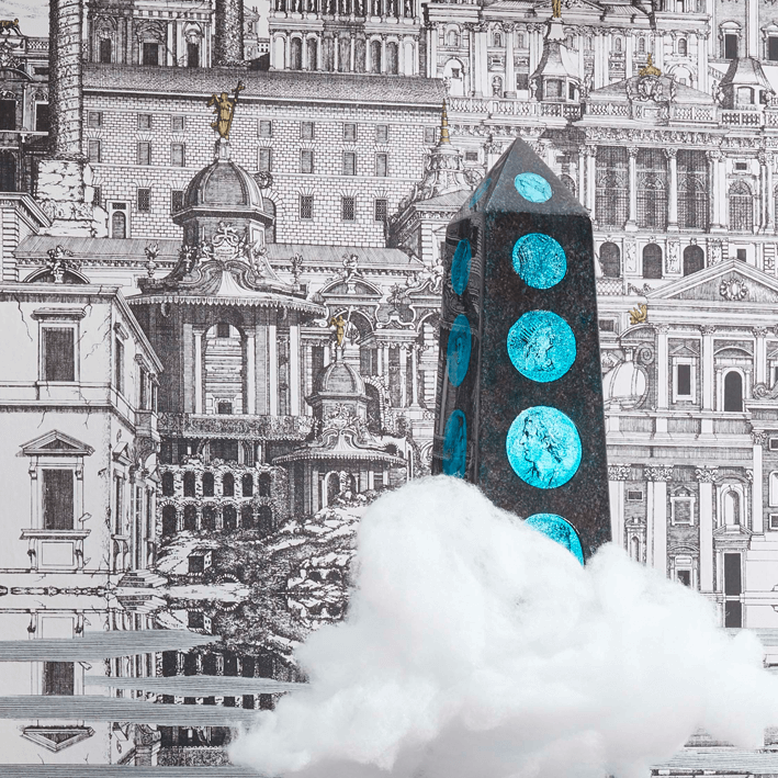 Riflesso에서 1955년 즈음 Fornasetti의 초현실주의적 시선으로 그려진 바로크 로마의 모습이 웅장하게 비추어집니다. 오른쪽에는 왼쪽의 거울처럼 비쳐지는 이미지가 떠오르고, 이 장면 전체가 아래 수면 위에 다시 한번 비춰집니다. 아이스 실버 하이라이트를 더한 블랙 앤 화이트로 만날 수 있습니다.