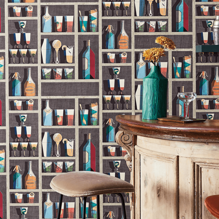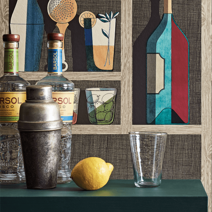 Derived from an ice bucket design entitled 'Oggetti Cocktail' created by Piero Fornasetti in the 1950s, Cocktails showcases the maestro's fascination with repeated studies of the same subject in order to create multiple variations upon the same theme. Its stylised mid-century graphic bottles and glassware were created in a vibrant Multi colour palette, true to the original sketches, which is complemented by a softer Pastel palette and the monochromatic Soot and Snow.