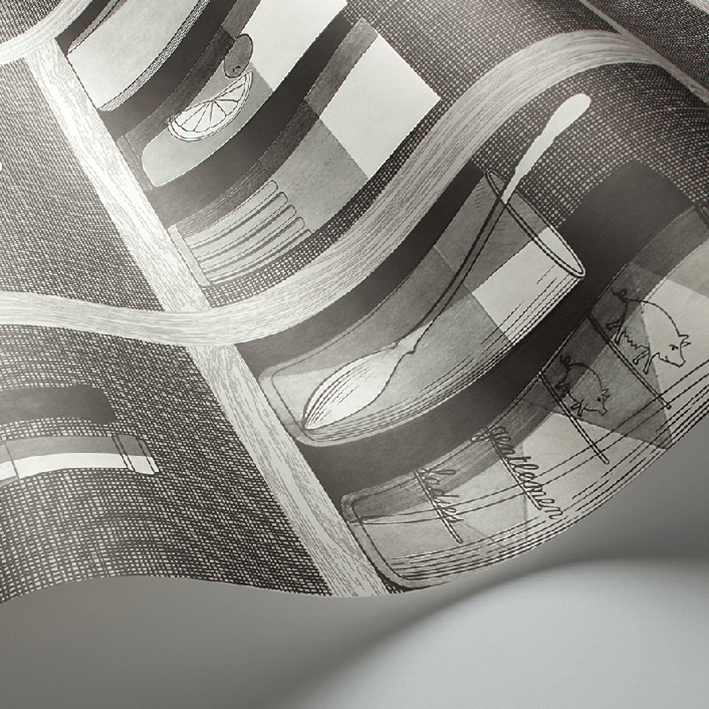 Derived from an ice bucket design entitled 'Oggetti Cocktail' created by Piero Fornasetti in the 1950s, Cocktails showcases the maestro's fascination with repeated studies of the same subject in order to create multiple variations upon the same theme. Its stylised mid-century graphic bottles and glassware were created in a vibrant Multi colour palette, true to the original sketches, which is complemented by a softer Pastel palette and the monochromatic Soot and Snow.