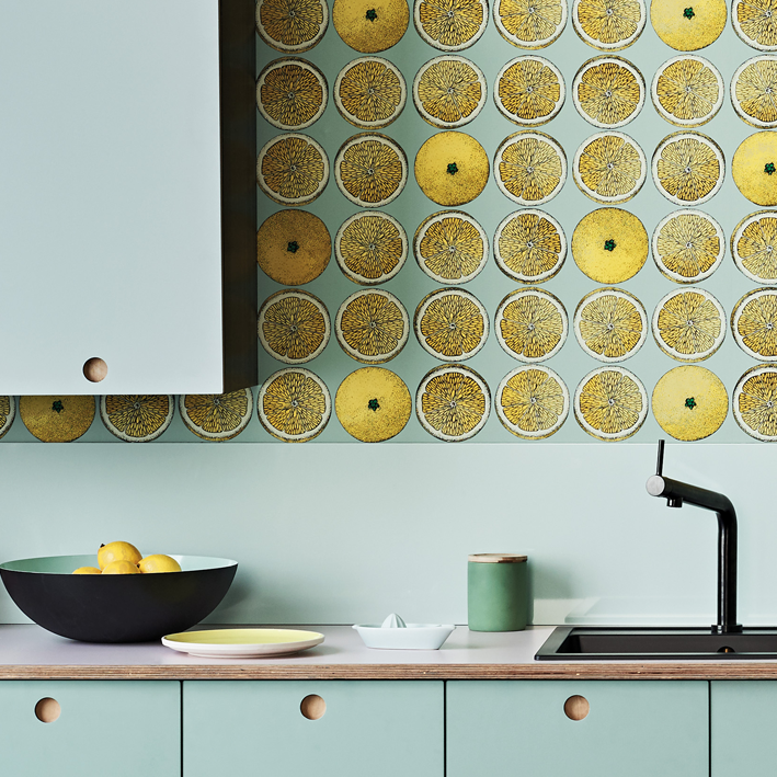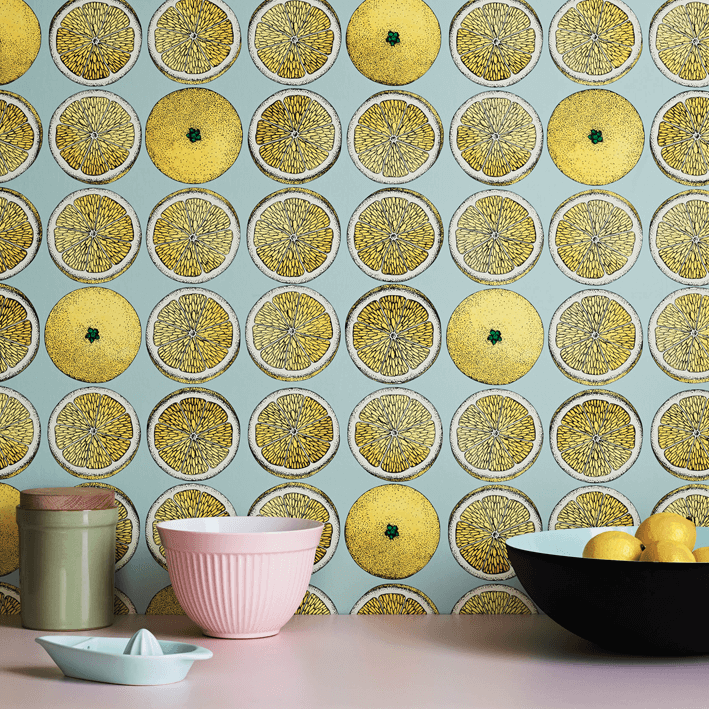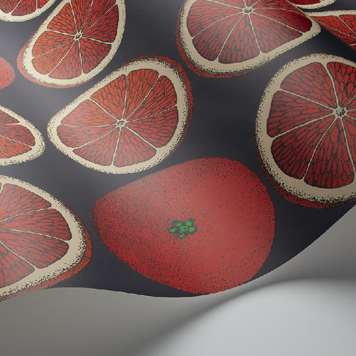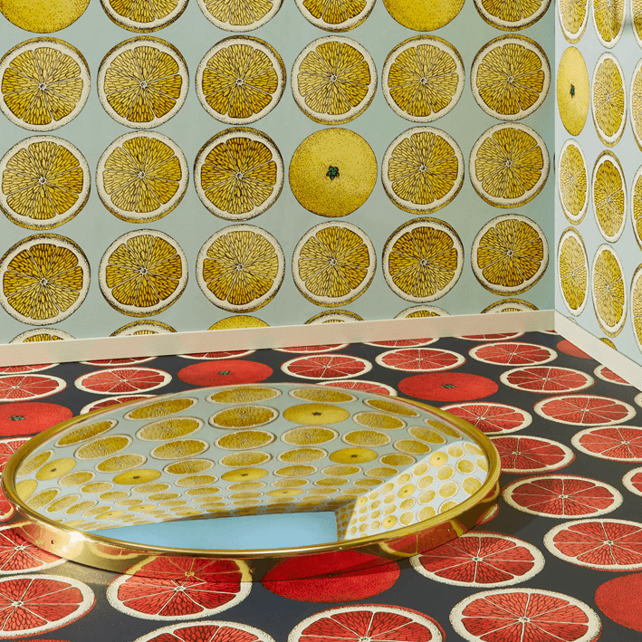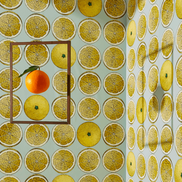 The bold repeat of Mediterranean citrus fruits seen in Arance are a prolific theme throughout the Fornasetti archive, originally appearing on the tray 'Fette d'arancia' in the 1950s and repurposed by Barnaba Fornasetti in the 90s as a graphic fabric print. This organic study has been produced in true-to-life palettes of Blood Orange, Orange, and Lemon on strikingly contrasting grounds of chalky Seafoam and Stone, as well as the sumptuous Ink.