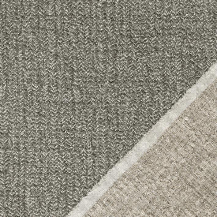 An innovative pocket cloth jacquard weave with an irregular texture reminiscent of a traditional Japanese embroidery technique used to prolong the life of textiles. A special finishing technique creates a textured surface reminiscent of quilting. This versatile linen cloth it is suitable for curtaining and light domestic upholstery and is completely reversable. Subtle contrasting tones on each face complement each other to give added interest to soft furnishings.