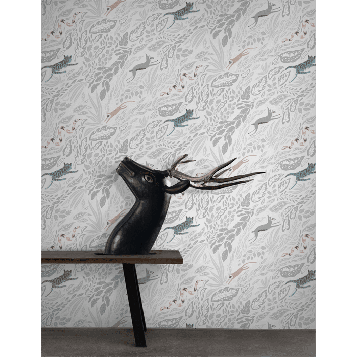 The Persecution wallpaper was designed by Marcos Navarro, whose work incorporates a stylish blend of urban and traditional techniques. The grey & white cool tropical jungle wallpaper features complexity and depth that will make you feel as if you are in the jungle yourself.