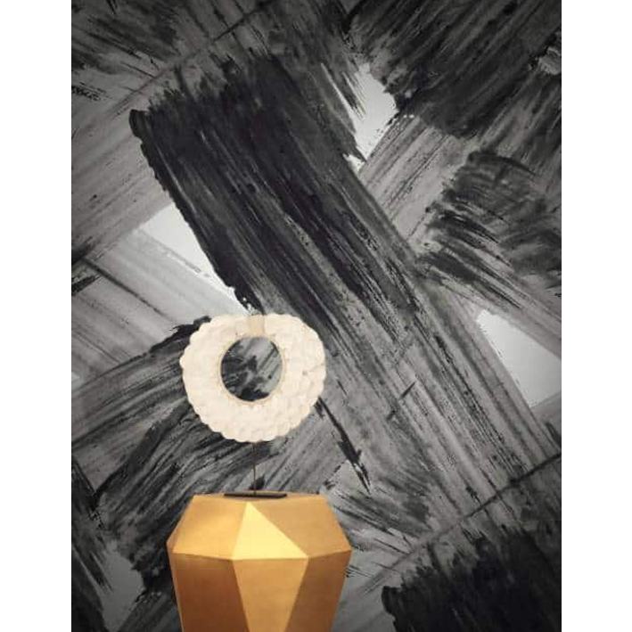 Plato wallpaper in monochrome features black and grey brushstrokes that glide across a white background. Made by Aoi Yoshizawa, the black contemporary abstract bold wallpaper includes evidence of the brush’s strokes and paint’s grain for extra texture and emotion behind the work.