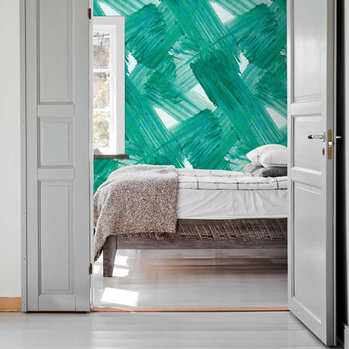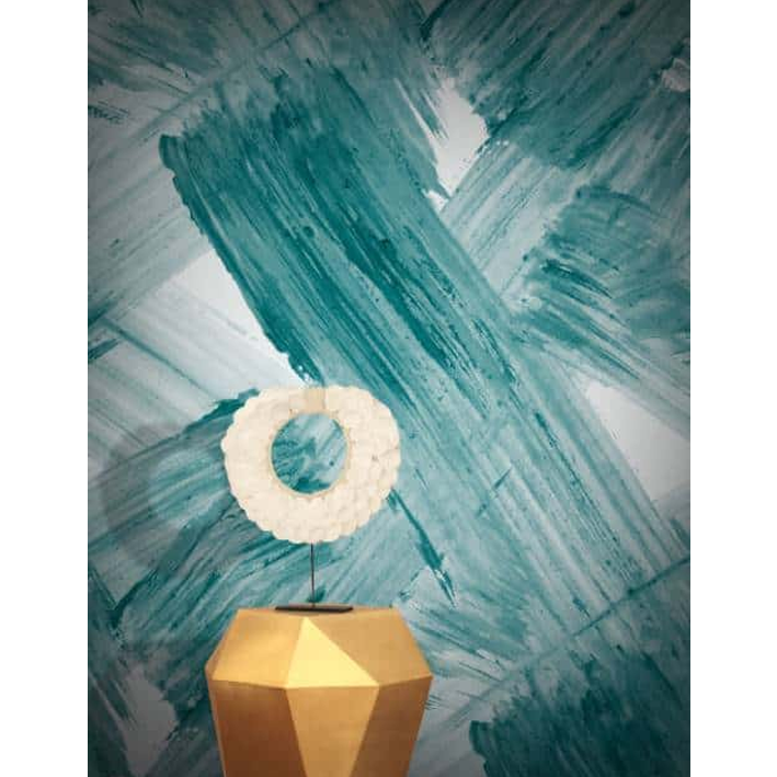 Light green brush strokes overlay a white background in Plate wallpaper by Aoi Yoshizawa. Originally hand painted, this teal contemporary abstract bold wallpaper bring together texture and movement to create a design of boldness that fits any room in a modern home.