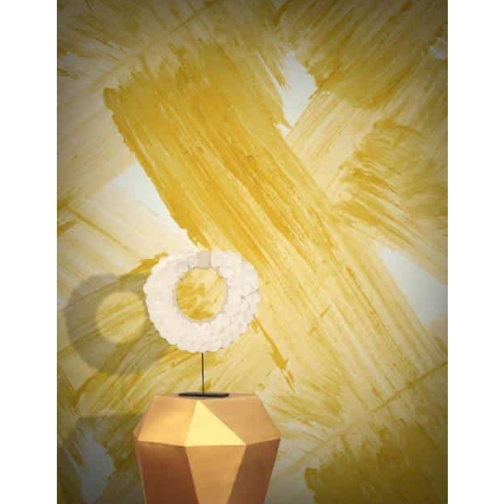 Plato wallpaper in cream captures the spectacle of an artist at work. It was originally hand painted by Aoi Yoshizawa and has gorgeous details that retain the brush movement and paint’s grain. This yellow contemporary abstract bold wallpaper creates an example of chaos and control and how they can work together.