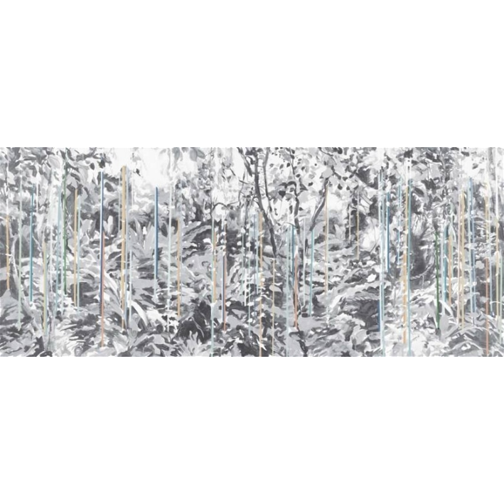 Raindrops wallpaper in spring envisions a magical forest with tall trees in hues of blue, green, and beige. This grey beautiful tropical forest wall mural was created by Tamara Piilola as a diptych of canvases painted with oil and offers a mysterious feel for any room.