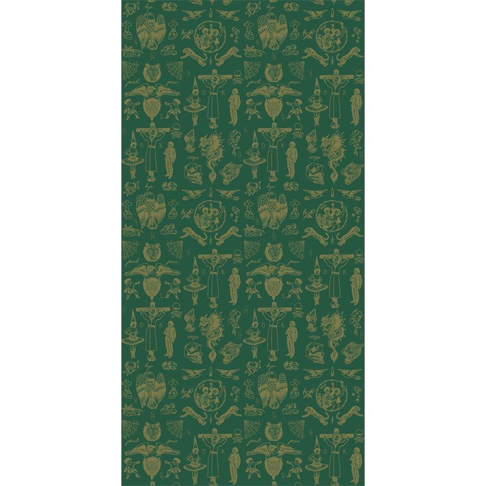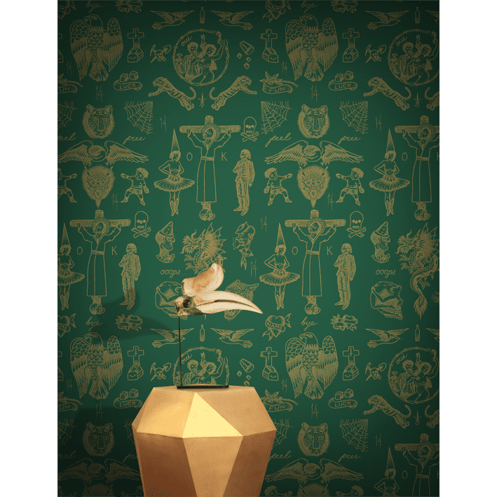This green tattoo wallpaper, part of our Tattoo Flash 01 range, was created by famed tattooist Liam Sparkes and offers something raw and brutal for those who want wallpaper that stands out. With its green background and yellow designer tattoos, this wallpaper features Sparkes signature style but for a wall rather than human skin.