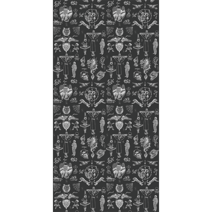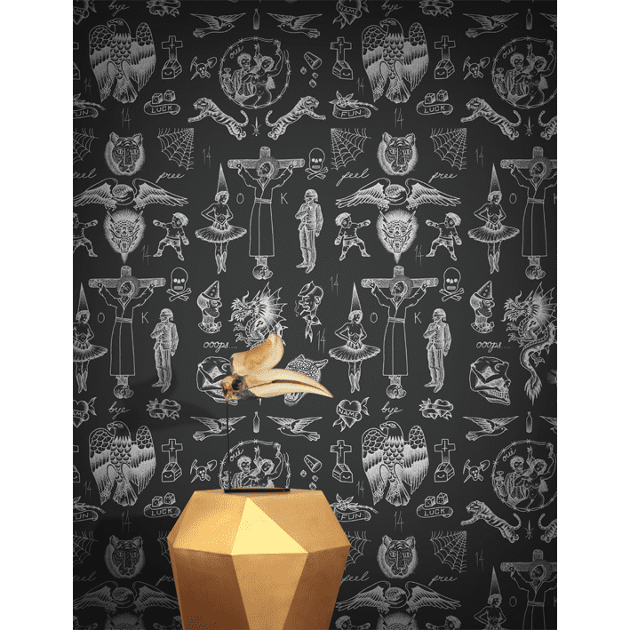 FEATHR.com collaborated with outstanding artist Liam Sparkes to create this black tattoo wallpaper, part of the Tattoo Flash 01 range, which brings originality and innovation to any wall. This cool designer black tattoo wallpaper features a selection of classic style tattoo designs in white on a black background that offers simplicity and style.