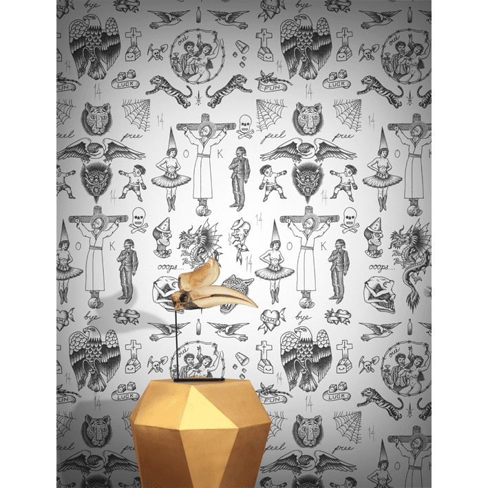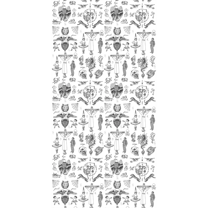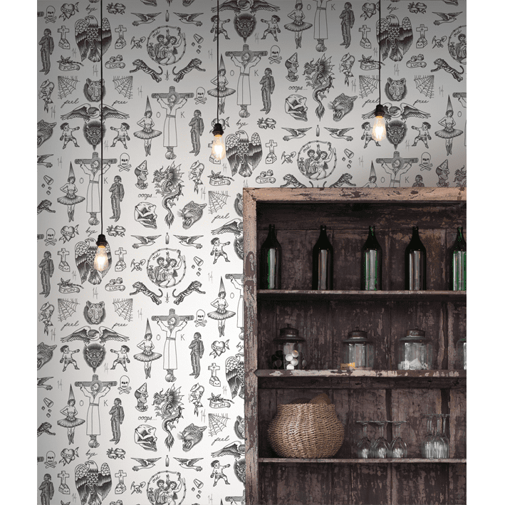 For this series of contemporary tattoo wallpapers, FEATHR.com worked with legendary tattoo artist Liam Sparkes. Famed for his Brutal tattoos, the artist runs the famous Old Habits Tattoo Studio in East London. For Sparkes originality is what tattooing is about. He has tattooed a variety of celebrity portraits including Kurt Cobain. This white tattoo wallpaper contains cool designs from tigers to spiders’ webs, so familiar to the tattoo lover.
