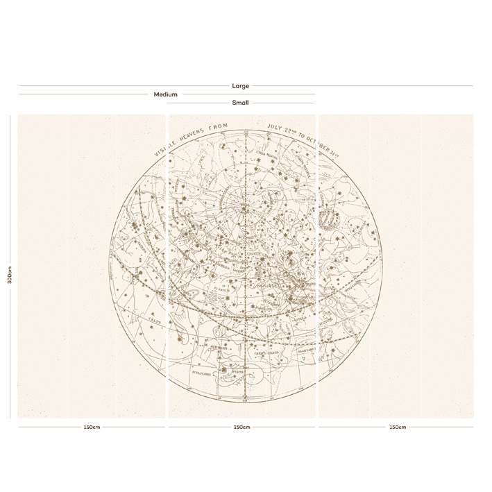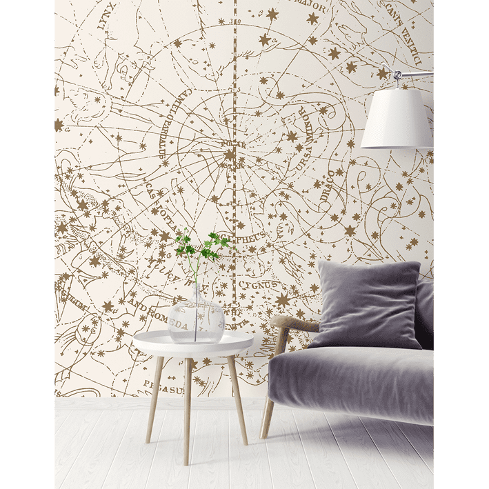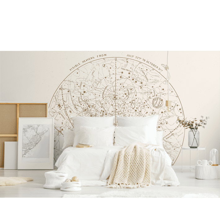 This beige & tan star constellation wall mural shows the visible night sky, with star constellations and planets. A stunning vintage constellation wallpaper full of detail – a great bedroom idea that’ll intrigue kids and adults alike.