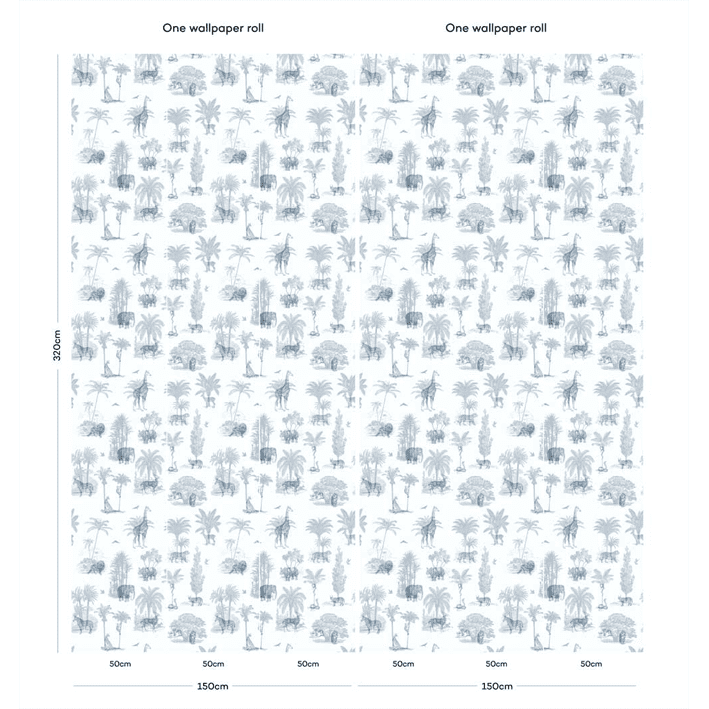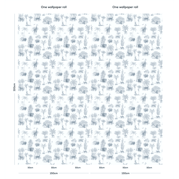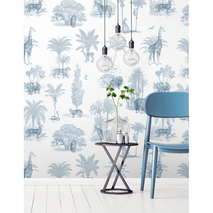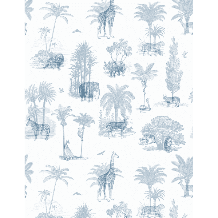 Exotic tropical animals dwell amongst jungle and palm leaves in this vintage toile de jouy wallpaper. This exotic tropical wallpaper has a trendy etched vintage look and features exotic animals like elephants, lions and giraffes. In cool blue this is a toile de jouy wallpaper for the wild side!