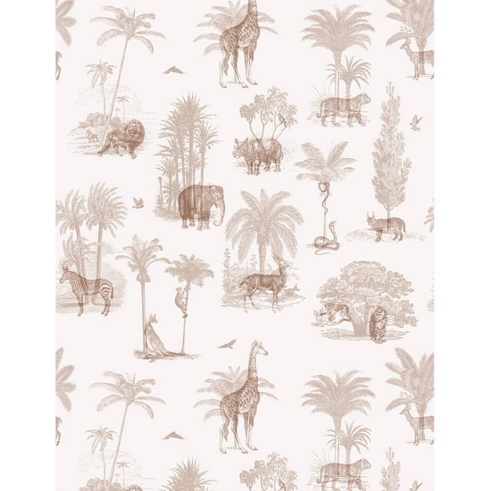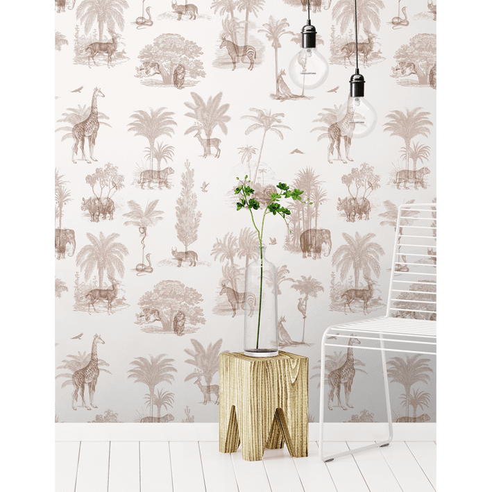 In Where They Belong Summer Brown, artist Florent Bodart transports tropical animals, palm leaves, and trees to any room’s walls. This brown tropical toile de jouy wallpaper incorporates a variety of animals including baboons, snakes, and gazelles on a dusky tan background.