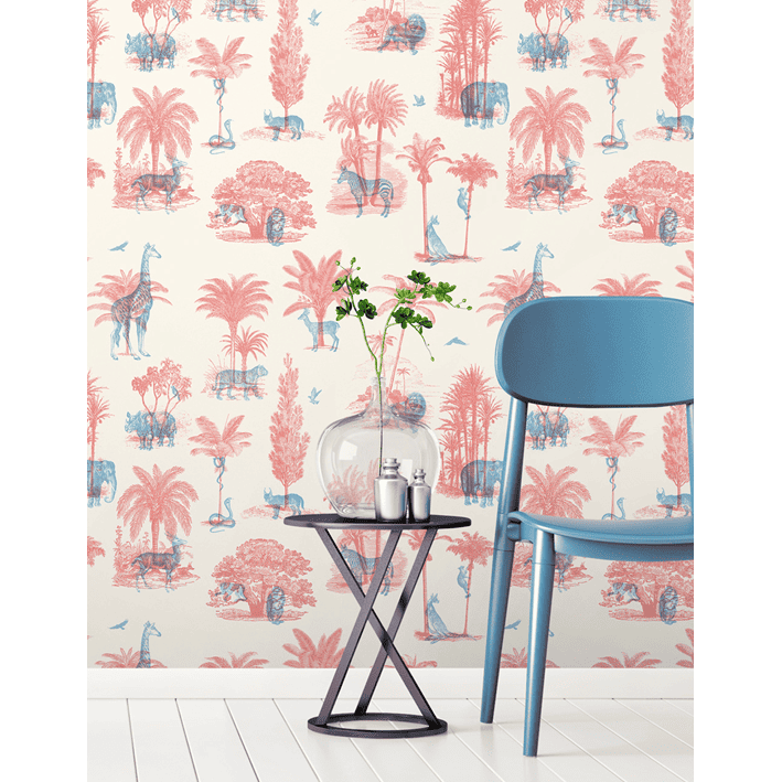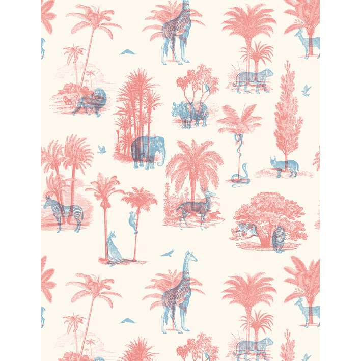 Exotic tropical animals dwell amongst trees and palm leaves in this tropical toile de jouy wallpaper. This exotic jungle wallpaper has a trendy etched vintage look and features exotic animals like elephants, lions and giraffes. In funky red and blue this is a toile de jouy wallpaper for the wild side!