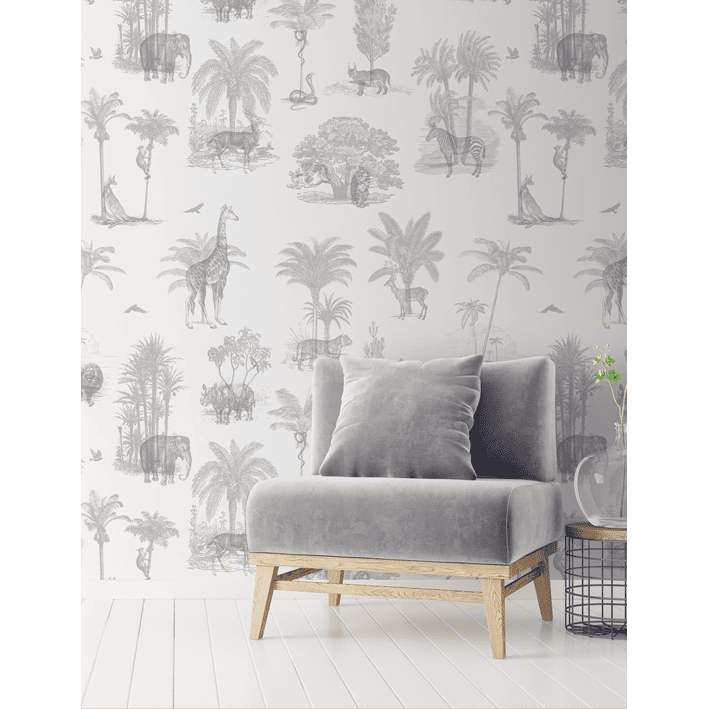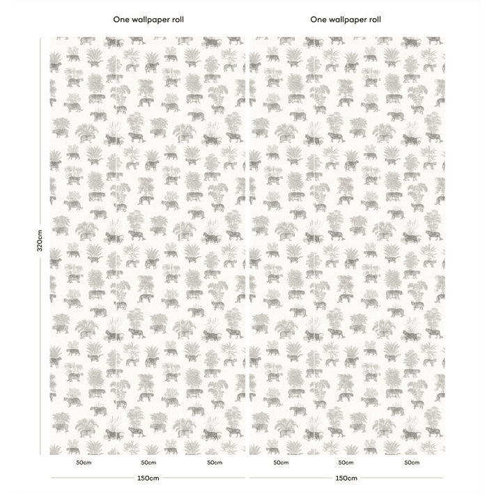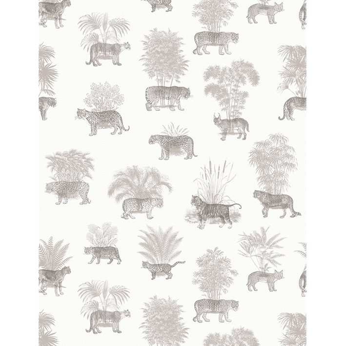 Tigers and leopards hide amongst palm leaves and tropical forest in this tropical animal toile de jouy wallpaper. With soft sand and brown colours, this modern tropical wallpaper mixes modern interior trends with vintage style: a great way to bring some tropical luxury into your home.