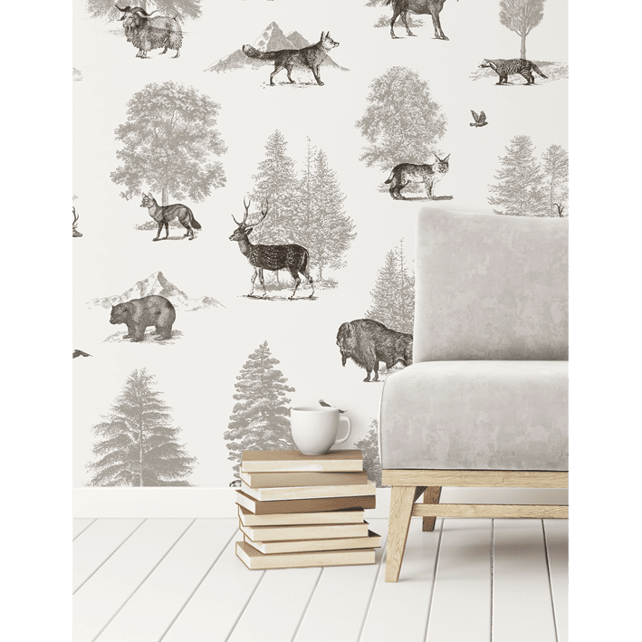 Head to the wilderness with this animal and tree toile de jouy wallpaper. Wild animals and birds like racoons, wolves, lynx and eagles roam amongst pine trees and mountains, imagined in this wallpaper in trendy vintage etched style. In trendy vintage colours, this is a animal toile de jouy wallpaper to bring the outdoors into your home.