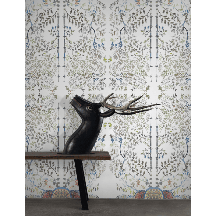 This multicolour & white romantic pretty floral wallpaper was designed by Chinese artist Xin Song who creates work based on collage and found imagery. Xinsong01 wallpaper uses an array of different colours to weave a beautiful image that grows from the floor up toward the ceiling.
