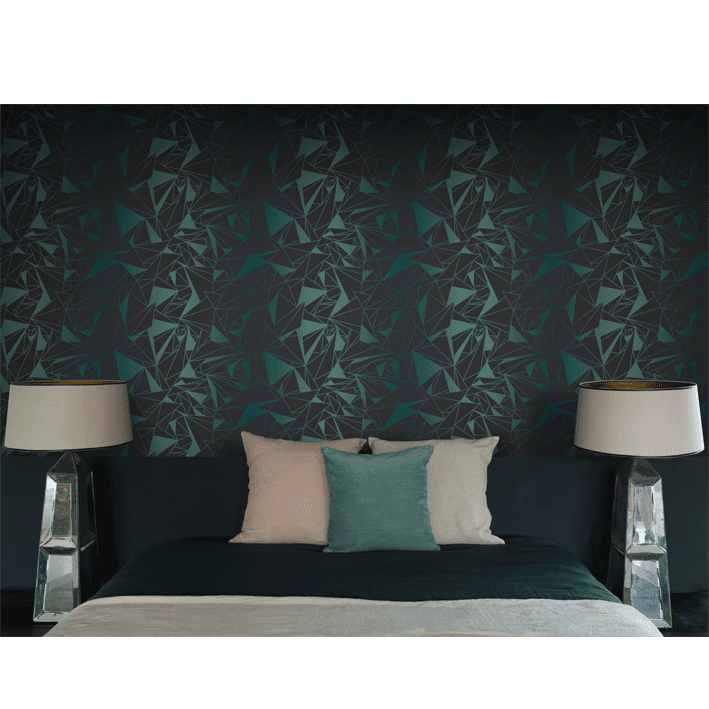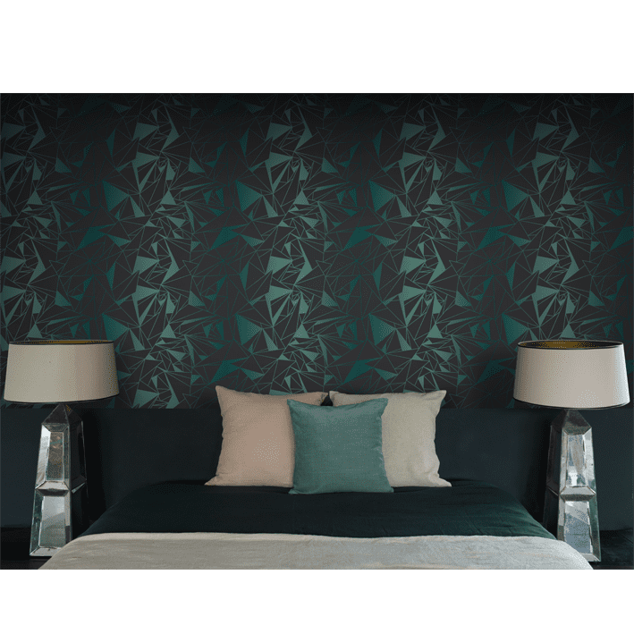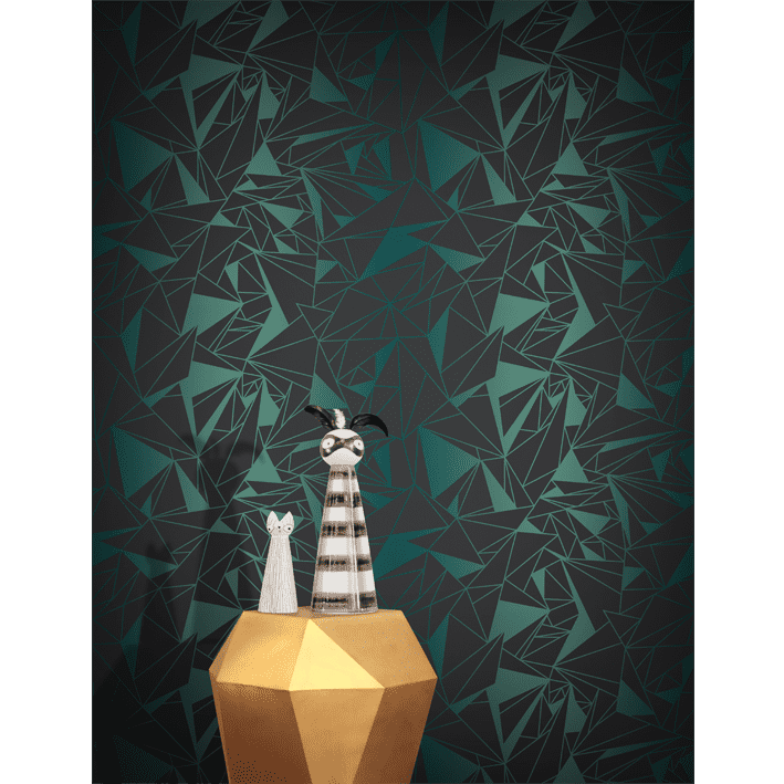 Elegant, deconstructed geometrics are on display with the Crystallise wallpaper designed by Glenn Todd. This green & black elegant geometric wallpaper manages to tie together charm, progress, and vitality in a luxurious way to offer a statement in any room.