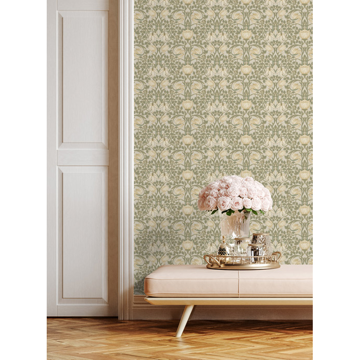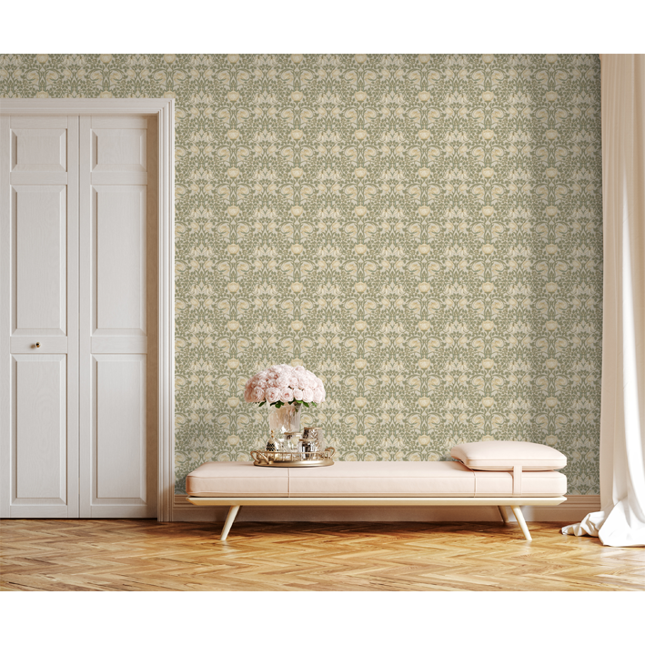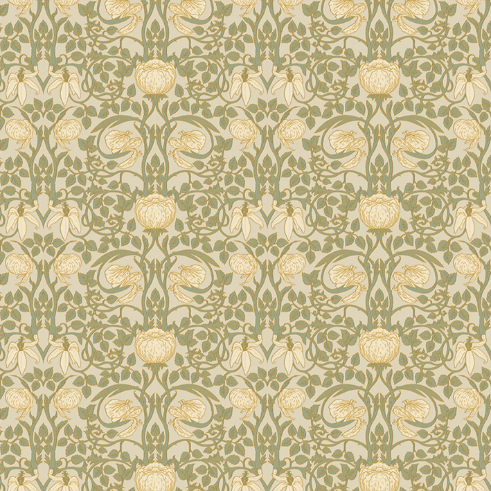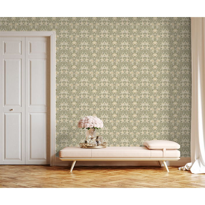 The Albion wall mural has an elegant metallic pattern that shows the evolution from the Arts and Crafts aesthetic into the Art Nouveau period that would follow. This cream & gold vintage pattern wall mural incorporates a metallic burnish so the floral flourishes stand out.
