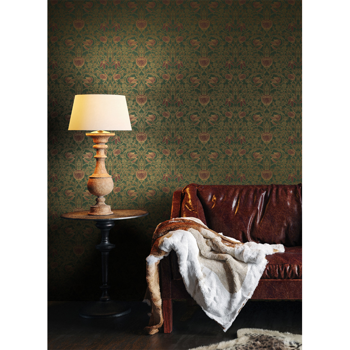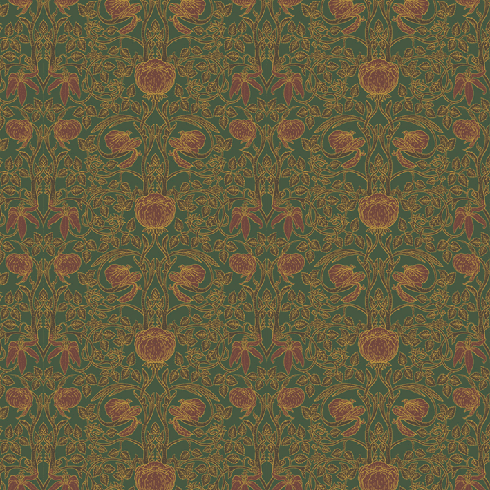 This exquisite green & gold vintage pattern wall mural takes inspiration from the Arts and Crafts movement through to the aesthetic of Art Nouveau. The Albion pattern wall mural has a vintage metallic flair that puts the floral blossoms at the forefront of the room.