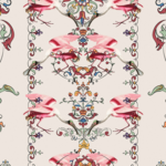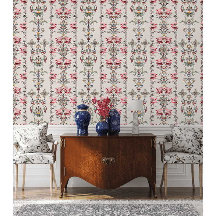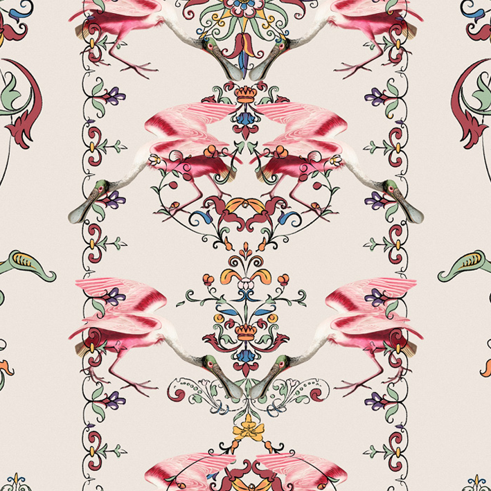 Bring a playful retro look into your home with this cream and pink tropical bird stripe wallpaper. This fun and stylish luxury wallpaper features a bright pink and cream stripe design, adorned with playful tropical birds. The pattern background is formed from a vintage illustration, whilst vintage hand-drawn spoonbill birds interlink to create a whimsical structure throughout the design. Perfect for any room, this wallpaper is sure to add a touch of whimsy and brightness to your décor. We’d recommend this stripe wallpaper for interior design schemes where you intend to create a on-trend, maximalist looks – full of tropical touches, quirky details and rich textures like velvet fabrics.