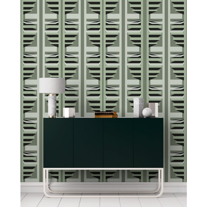 If you are looking to create a retro feel geometric style, this wallpaper designed by artist Tim Muddiman is the perfect choice. The green funky geometric wallpaper design features blocks, lines and angles that create a rhythmic pattern across the design. Clever use of colour creates shadow that draws us deeper into the rectangular latticework. Choose this green wallpaper to make a geometric statement in a contemporary home interior.