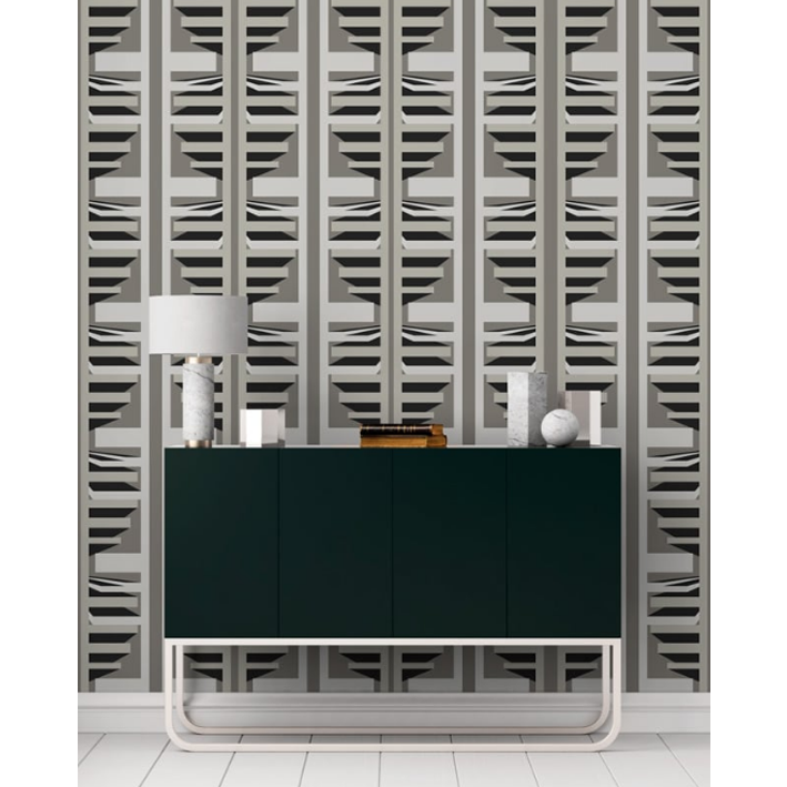 If you are looking to create a retro feel geometric style, this wallpaper designed by artist Tim Muddiman is the perfect choice. The grey funky geometric wallpaper design features blocks, lines and angles that create a rhythmic pattern across the design. Clever use of colour creates shadow that draws us deeper into the rectangular latticework. Choose this funky wallpaper for a bathroom or powder room to make a style statement.