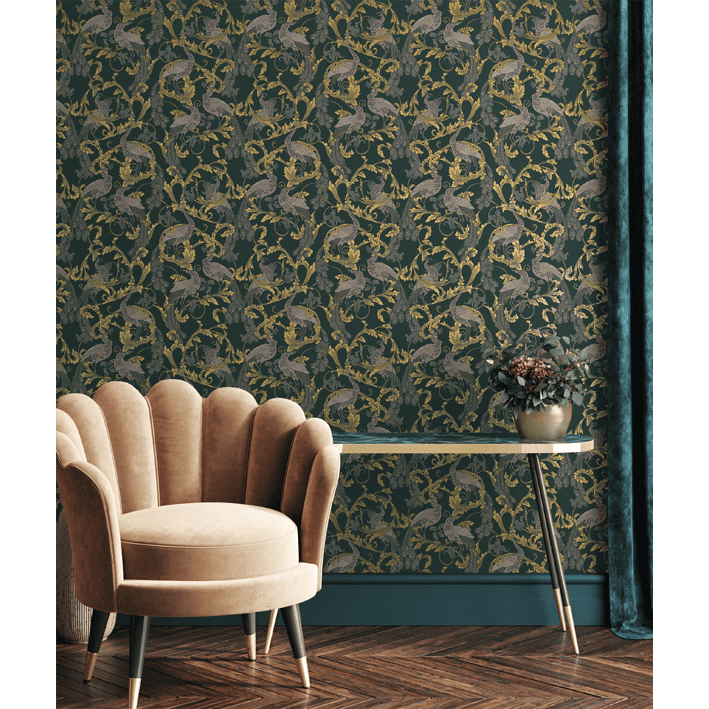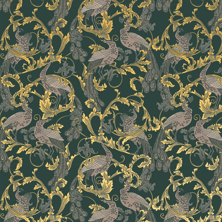 The Arcadia wall mural features an opulence borne in its inspired style from the Mingei Folk Art movement of early 19th century Japan. This green & gold vintage peacock wall mural offers a balance of elegance without pushing into ostentatiousness and features peacocks that signal rebirth and beauty.