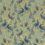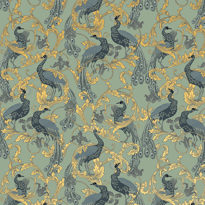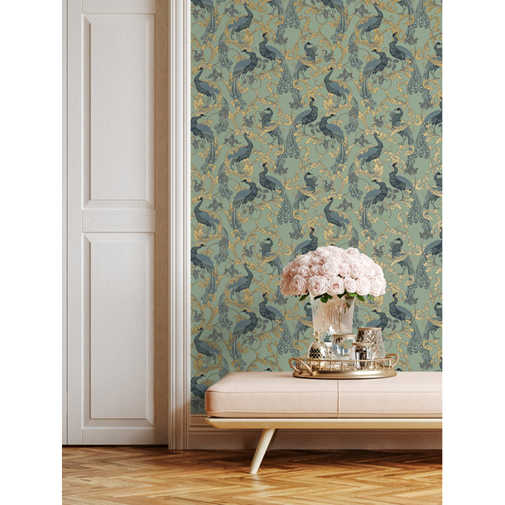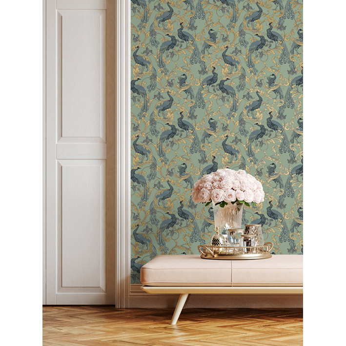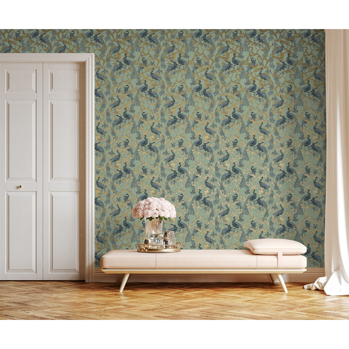 This green & gold vintage peacock wall mural is influenced by the Mingei Folk Art movement of 19th century Japan and is sure to create an opulent space in the home. The Arcadia wall mural focuses on the peacock as a way to highlight beauty and rebirth and comes with metallic flourishes that draw in the eye.