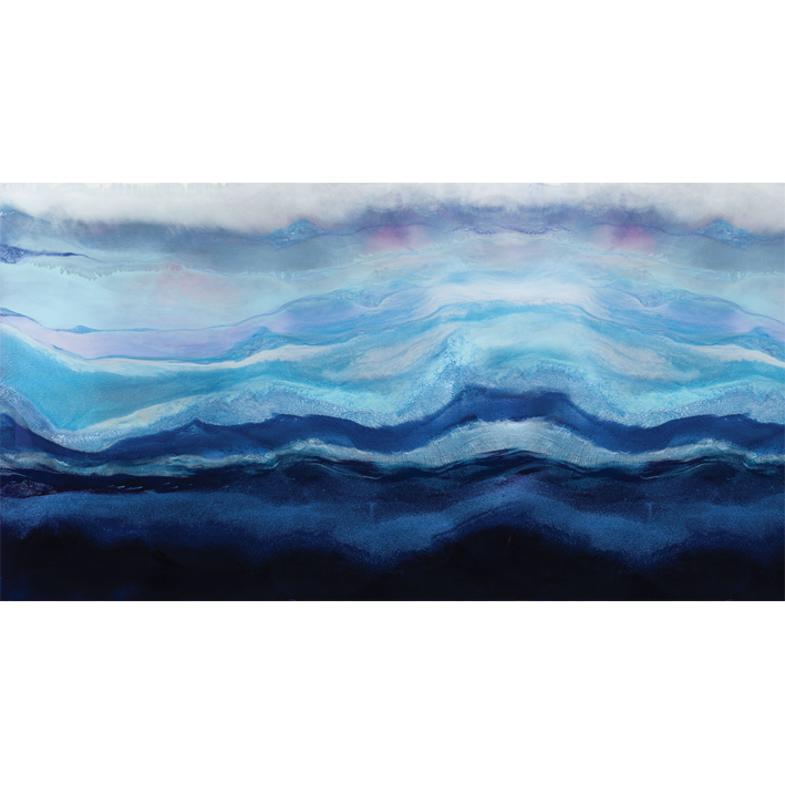 This richly pigmented seascape wallpaper mural is layered with hues of indigo and aquamarine pigments. Depth and movement were created to draw the viewer into the waves. A layer of arctic mist hovers above the water creating a sense of chill in the air. A cool toned color palette was used to create this modern resin painting.